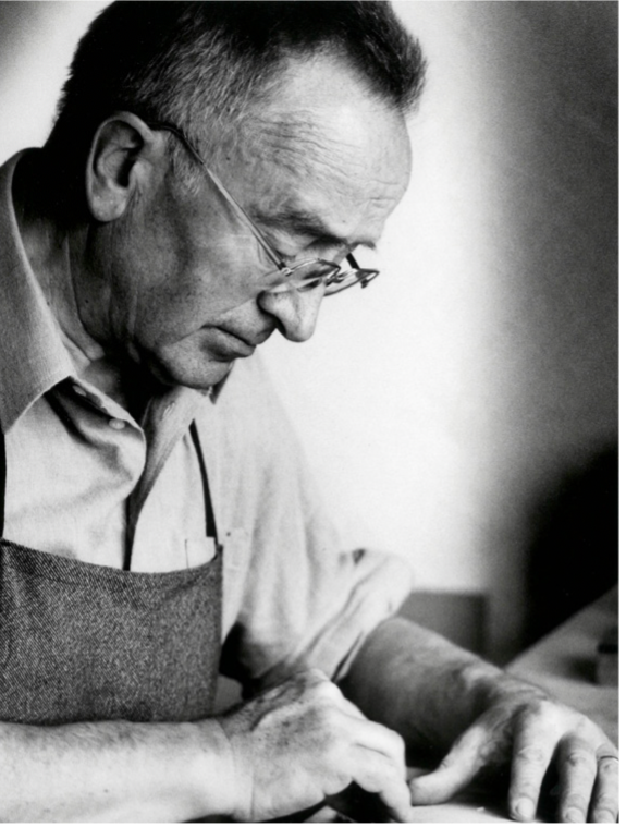 Atelier d'un sculpteur de volutes à Schönbach - Photo : Ing. Strauss lors de son voyage à Schönbach en 1946